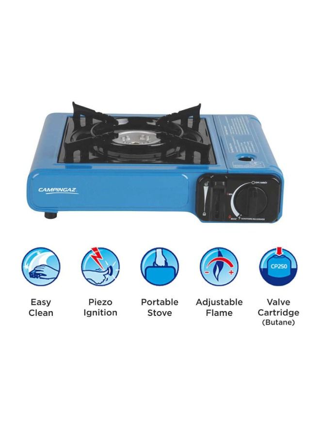 With its sturdy plastic carry case, this stove can be easily and safely transported and stored, while its integrated piezo ignition system is simple to use and extremely reliable. Featuring an easy clean fixed enamelled pan support for additional stability. It also features a cartridge safety locking system for correct and safe cartridge insertion every time.