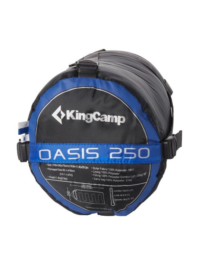 • Excess. Rest easy under the stars in KingCamp's 44°F Oasis 250 sleeping bag, featuring a water-resistant shell and fortified with low-bulk synthetic insulation for just-right warmth.