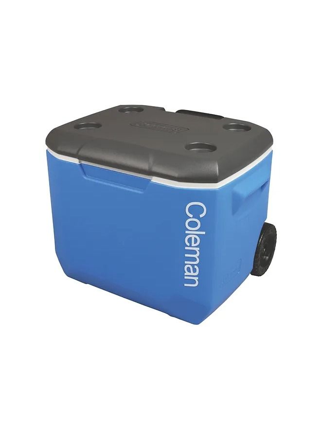 Keep your food and drinks cold, and keep the fun going, for up to 4 days when you roll in with a Coleman® 60 Quart Performance Wheeled Cooler. Large enough to hold 94 cans, you'll have plenty of space for refreshments for a whole group of people. Whether you're headed on an overnight camping trip, to a tailgate party, or across the ball field, the heavy-duty wheels and long, telescoping handle let you roll over almost any terrain with hardly any effort. The additional molded handles make it easy to lift your cooler in and out of the car or onto a picnic bench. Once you arrive, the Have-A-Seatâ„¢ lid will ensure you always have a place to sit and relax, and the cup holders molded into the lid will keep your cold drink close while you enjoy the day. When the fun is done, the EZ-Clean top wipes clean, and the leak-resistant drain makes it easy to empty any excess water, so you're ready for your next fun adventure.