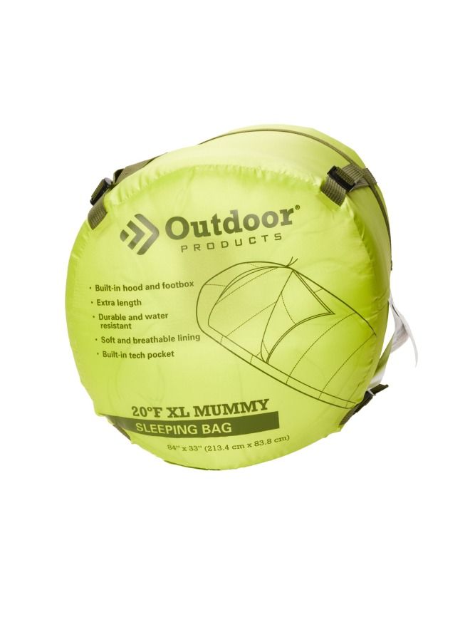 • Closeout. Enjoy a night under the stars in this Outdoor Products sleeping bag, built with a water-resistant shell, lofty hollow core fiberfill for warmth and a roomy footbox for easy movement.